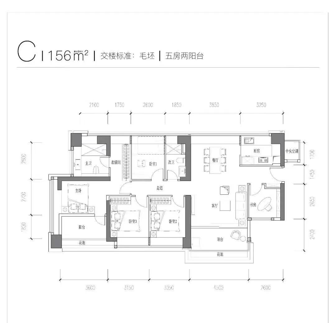 建面约156平方米的户型为五房两厅两卫,其中主卧里还带有一个宽阔方正的阳台,整体的空间利用率较好。
