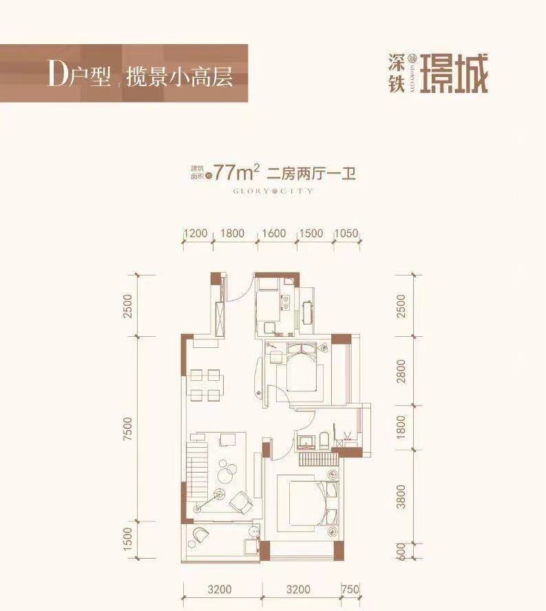 其中,77平方米的户型被设计成两房两厅一卫。