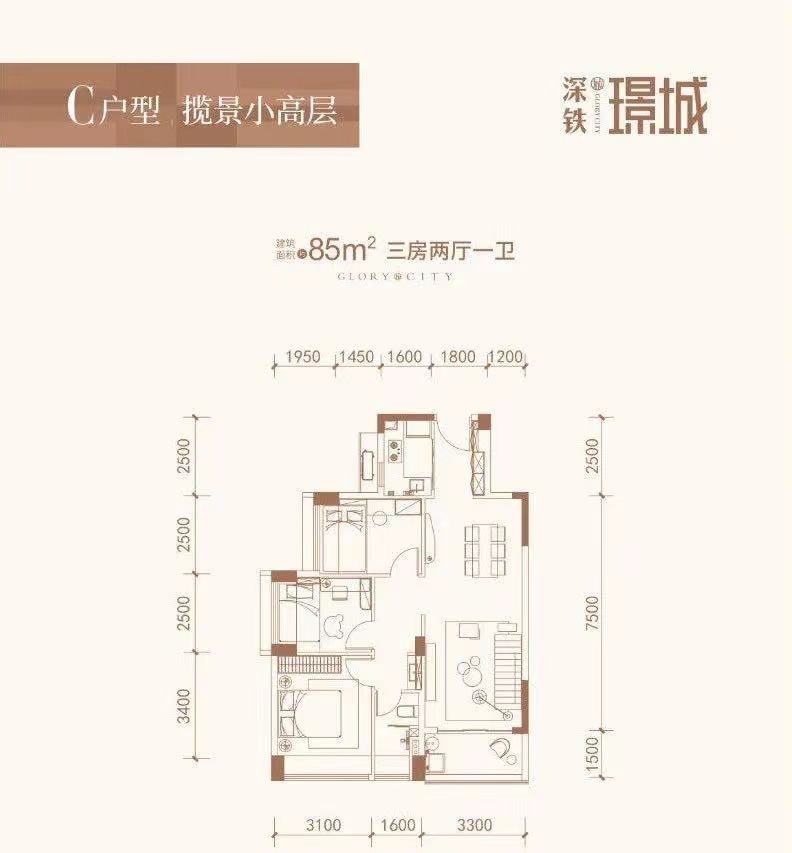 85平方米的户型被设计成三房两厅两卫,动静分离。