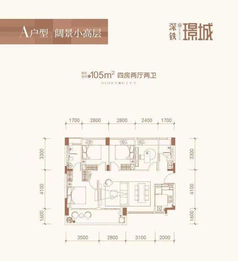 105平方米的户型被设计成四房两厅两卫,满足刚需家庭的居住需求。
