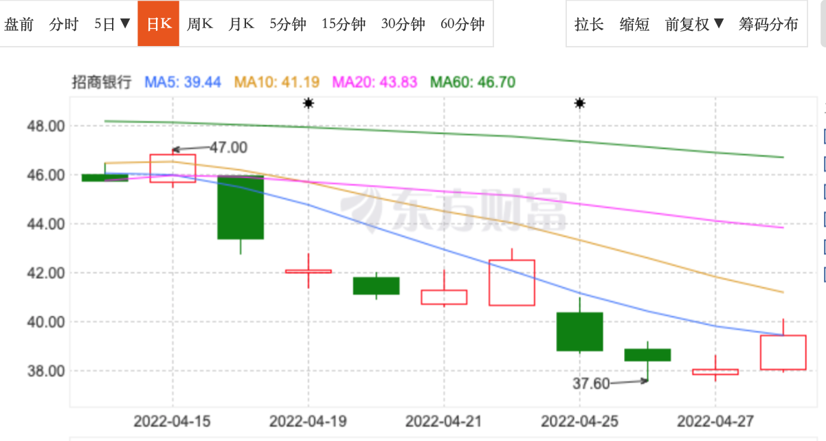 受高层变动等因素的影响,招商银行近日股价波动较大。按收盘价计算,4月15日(周五)收盘价46.83元/股,4月27日收盘价38.04元/股,跌幅达18.77%。