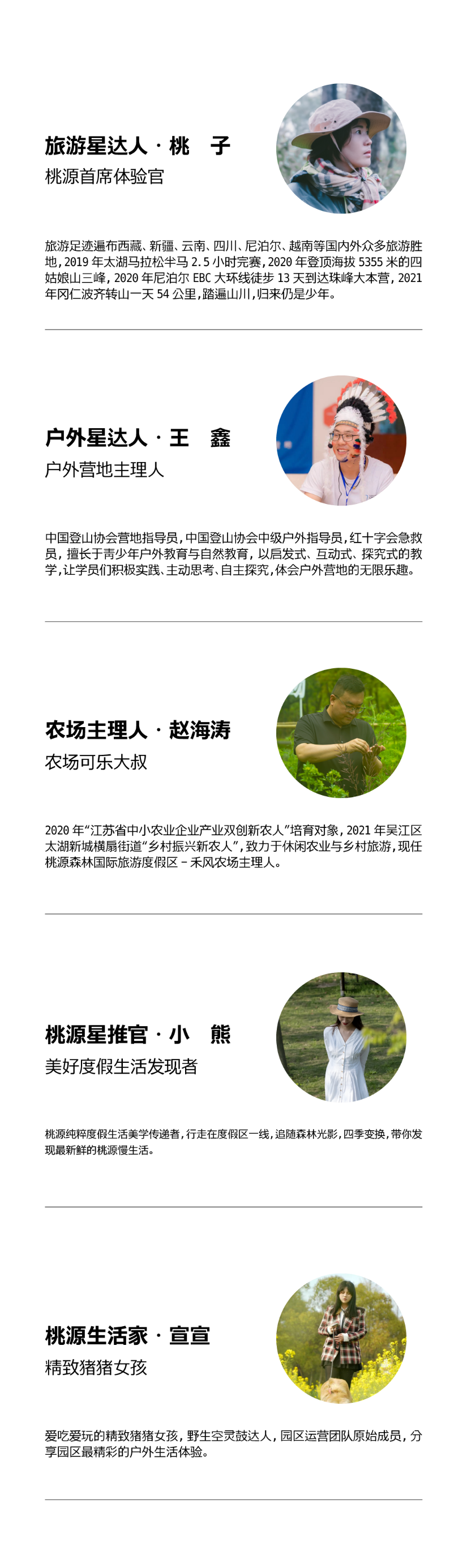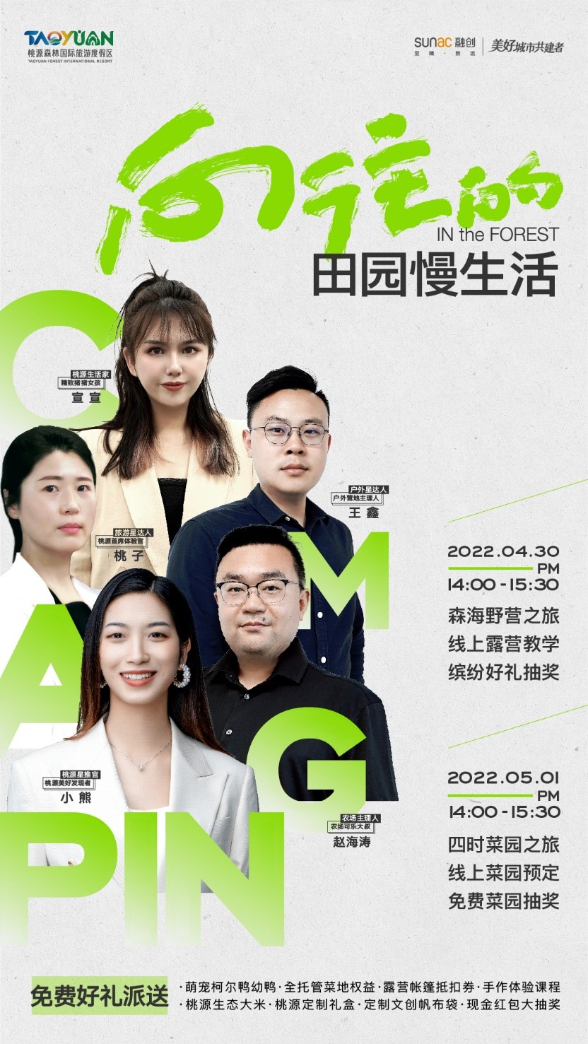 跃入森海,探秘森野,桃源首席体验官桃子、户外营地主理人王鑫、农场可乐大叔赵海涛、桃源美好发现者小熊、桃源生活家猪猪女孩宣宣,五大主播亲临实地现场,线上直播与你相约桃源。