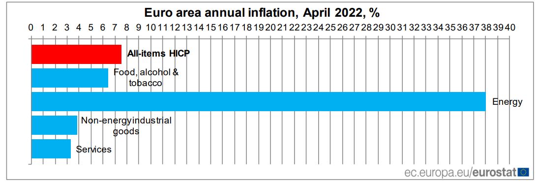 欧盟统计局的数据显示,欧元区4月的通胀率达到了1997年有统计以来的最高,高于3月的7.4%。4月,该地区能源价格同比上涨38%,能源价格攀升是推高通胀的主要原因。