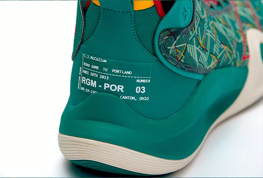 据介绍,“CJ1地毯”以波特兰机场标志性地毯为灵感,用于纪念麦科勒姆效力9年的城市。红绿混搭的鞋身印花取自地毯上的标志性图案,后跟处的标贴设计模拟机票造型,记录他从家乡俄亥俄到波特兰的经历。