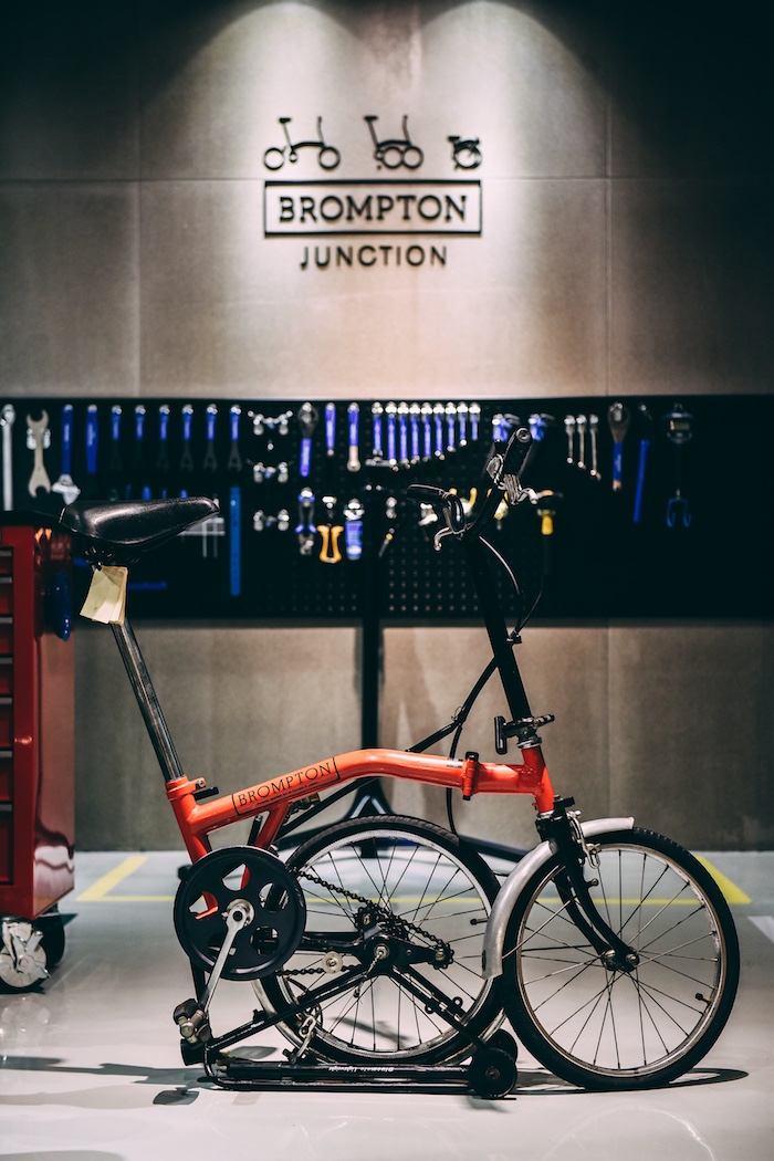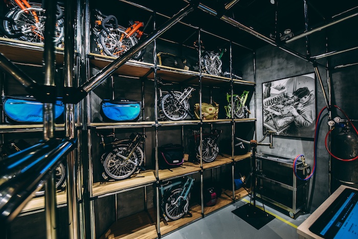 在Brompton上海K11的门店里,除了有摆在格子里的一排排自行车来展现其“折叠”的特性,做旧的气瓶、成套的维修工具等工厂元素成为了这家店最大的特色。这也是品牌在全球范围内第一次在门店设计上做出这样的尝试。