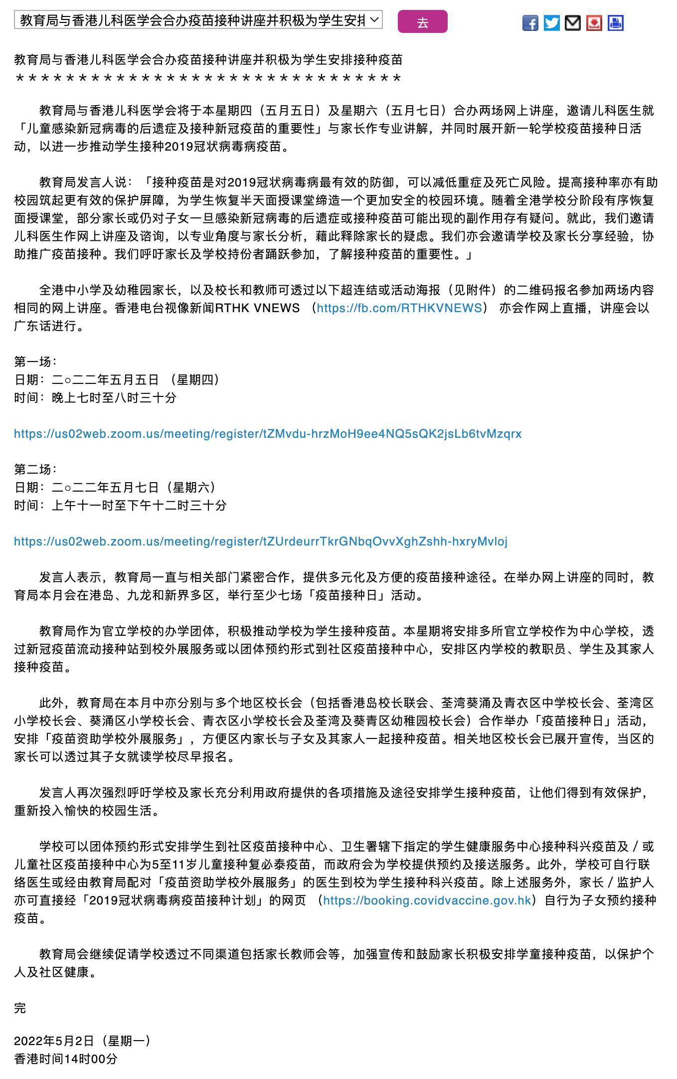 据香港特区政府5月2日新闻公报,香港特区教育局与香港儿科医学会将于本星期四(5月5日)及星期六(5月7日)合办两场网上讲座,邀请儿科医生就“儿童感染新冠病毒的后遗症及接种新冠疫苗的重要性”与家长作专业讲解,并同时展开新一轮学校疫苗接种日活动,以进一步推动学生接种新冠疫苗。