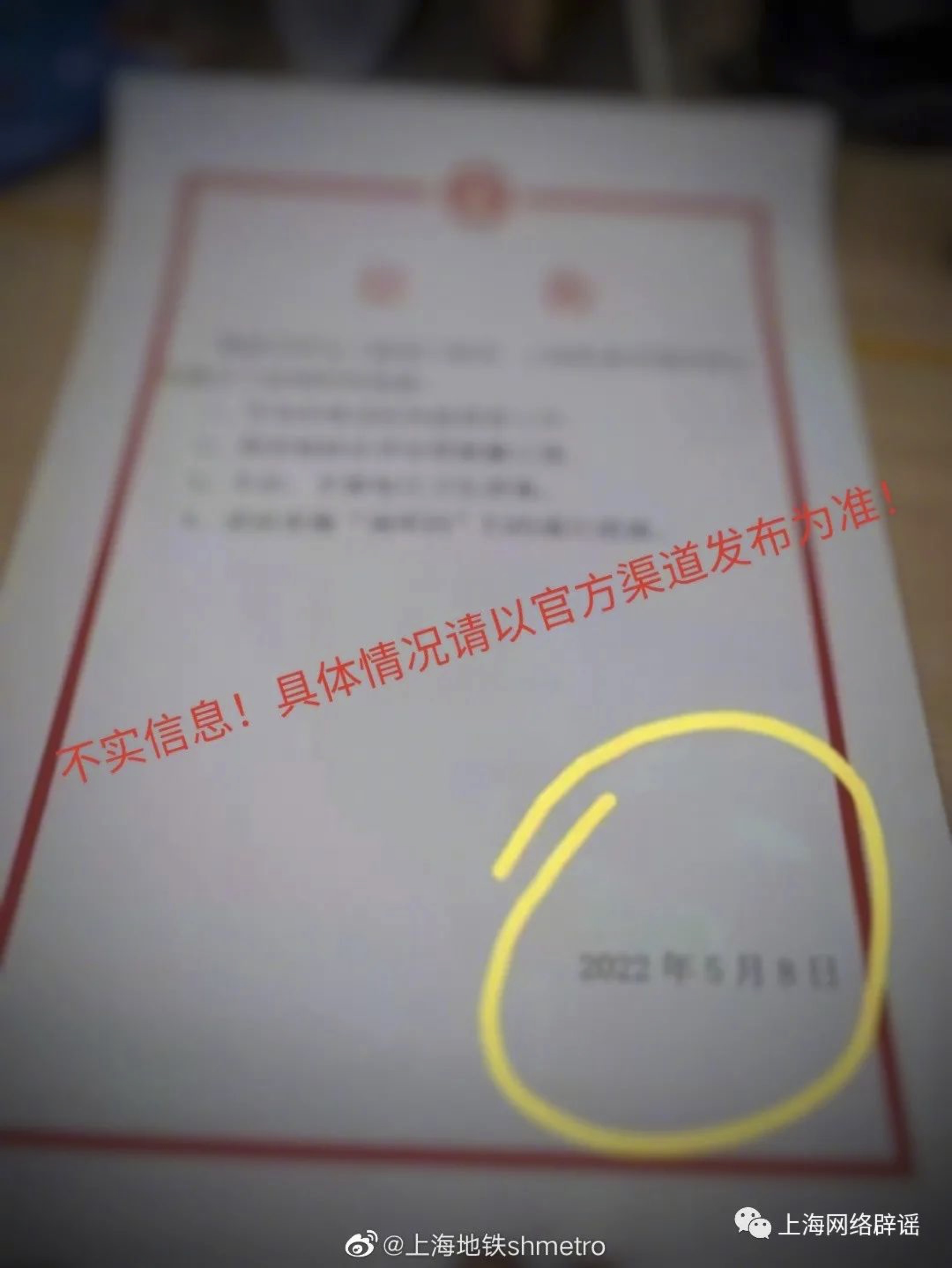“上海网络辟谣”微信公众号消息,近日,有网传消息称,“上海地铁发布将于5月某日恢复运营”,引发网友热议。针对该网传消息,5月3日晚,上海地铁官方微博发布声明称,消息不实。目前,上海地铁仅6号线(不含五莲路、德平路、北洋泾路)和16号线维持运营,其他线路仍暂停运营。接下来,上海地铁将根据疫情防控形势及上级部署,积极准备恢复工作;一旦确定运营恢复日期,将第一时间通过官方渠道对外公布。