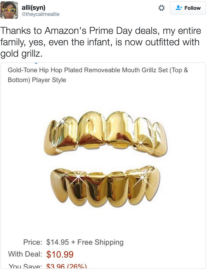 昨天是美国亚马逊会员日,买家们翘首以盼的打折日终于到了,但当大家准备好剁手刀的时候才发现,亚马逊在打折的东西都非常奇怪,比如这个11美元的说唱金牙。