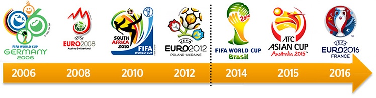 除了欧冠外,在世界足坛的各项大赛中,我们也都不难发现马牌轮胎的身影。无论是2006德国世界杯、2008奥地利瑞士欧洲杯、2010南非世界杯、2012波兰乌克兰欧洲杯、2014巴西世界杯还是今年的法国欧洲杯,马牌始终孜孜不倦地开拓着体育营销市场,渴望在其中收获成功。