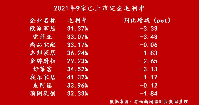 财报显示,定制家居行业的毛利率出现普遍下滑现象。据界面新闻记者统计,2021年已上市的9家企业毛利率均值约33.91%,同比下降1.95个百分点。