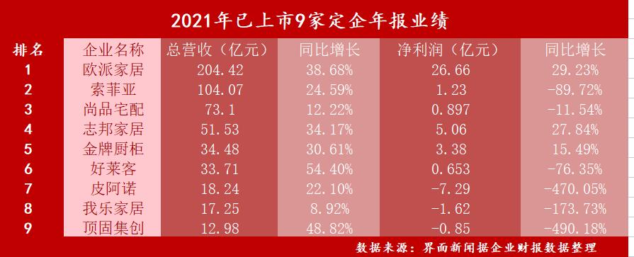 据界面新闻统计,2021年,已上市9家企业中净利增长的仅有3家,其中净利突破1亿元的有4家,分别是欧派家居、索菲亚、志邦家居、金牌厨柜。
