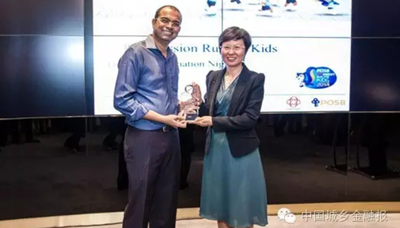 新加坡国会议员向农行新加坡分行颁发储蓄银行百胜儿童基金纪念奖杯。