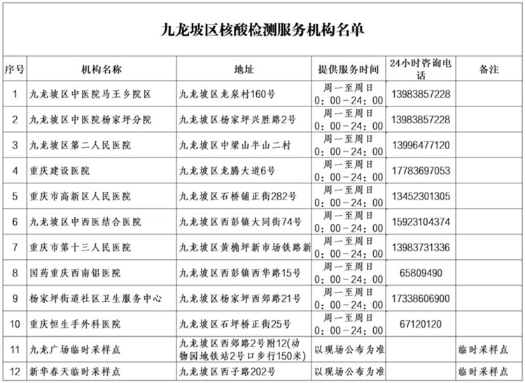 九龙坡发布微信公众号消息,根据目前疫情防控工作安排,为满足广大市民朋友核酸检测需求,九龙坡区现开设10家24小时核酸检测门诊,可为黄码、绿码人员提供核酸检测服务。同时,在九龙广场和新华春天小区开设黄码人员临时采样点,采样时间以现场公布为准。
