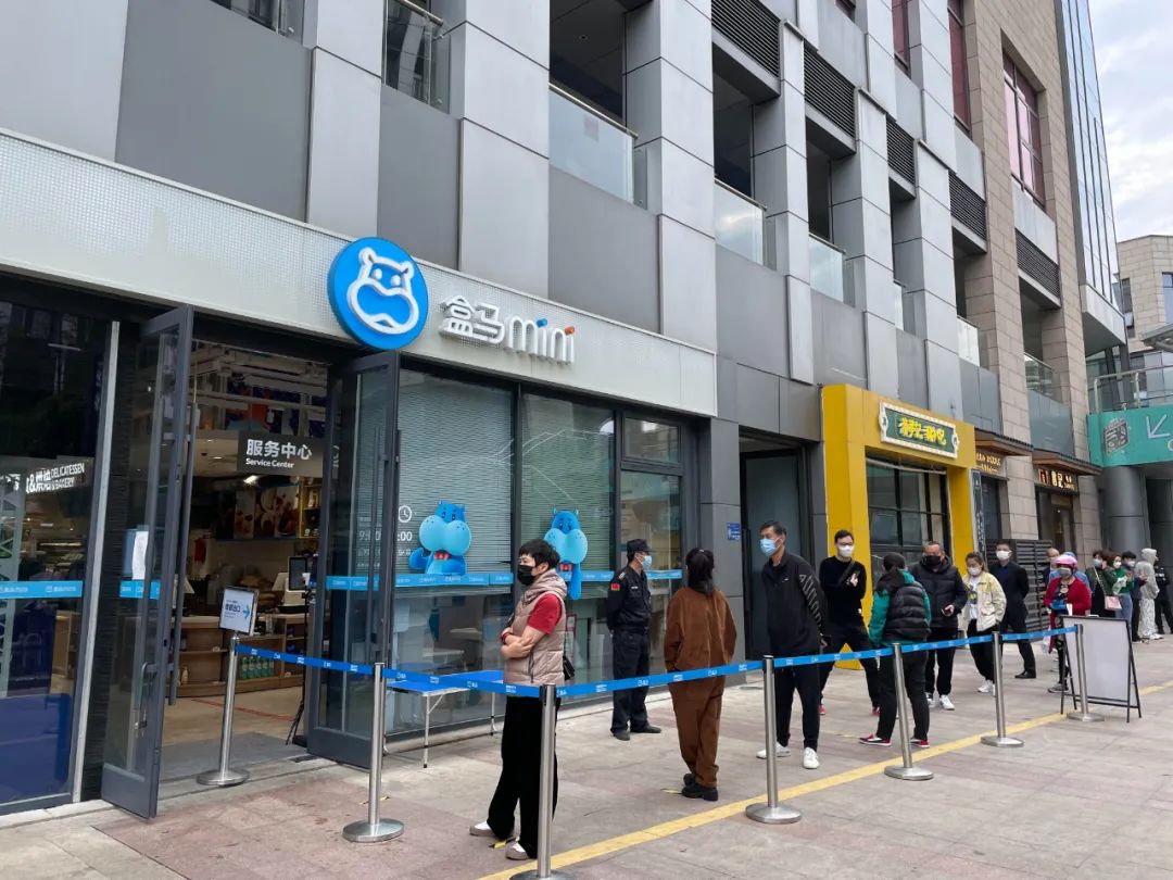 在上海奉贤区宝龙城市广场,盒马鲜生mini店近期恢复了线下运营。同样,市民仍要提供个人行程码和小区出入证明,并自觉间隔两米社交距离、排队进入这家650平方米左右的超市。