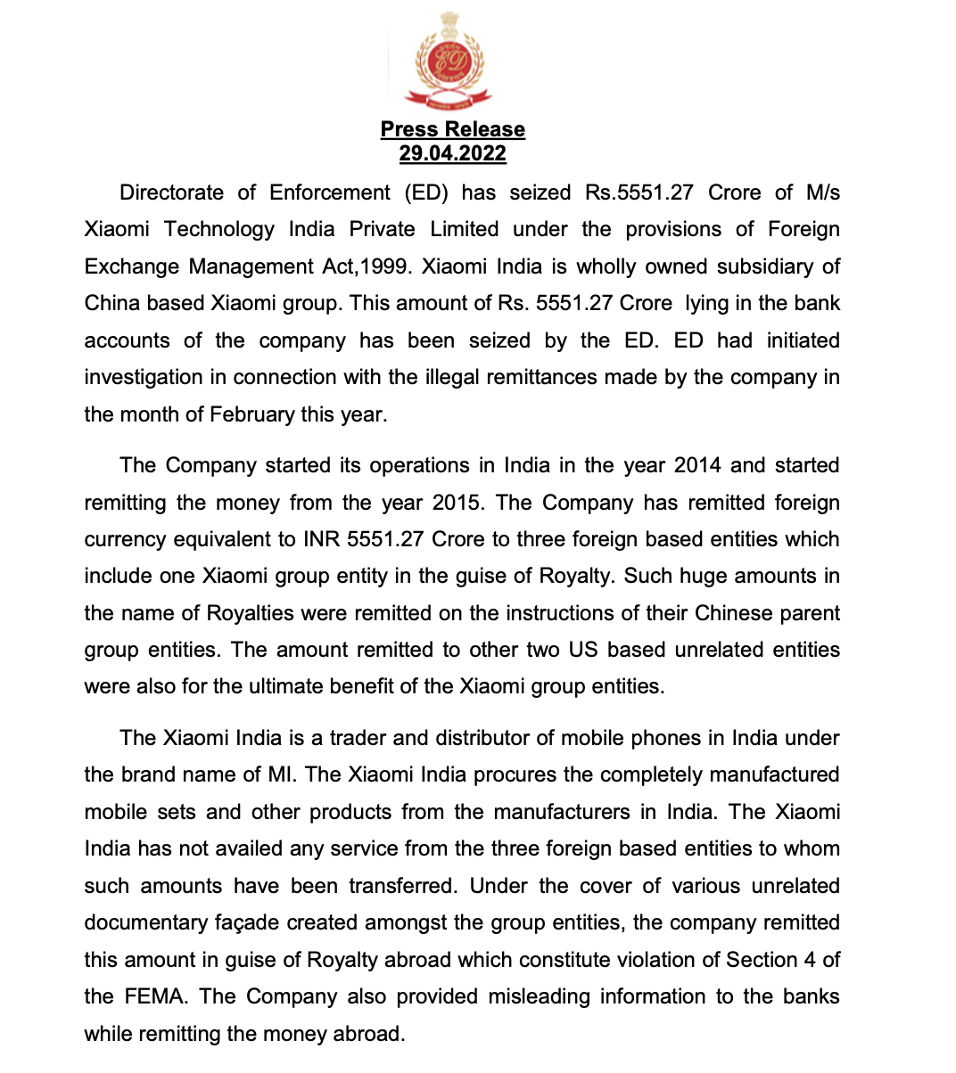印度执法局提到,小米印度是印度手机贸易商和分销商,品牌为MI(即小米)。小米印度从印度制造商采购完整制造的手机和其他产品,小米印度并没有从三家外国实体获得任何服务,这些款项已经转移给这些实体。在集团实体之间创造各种不相关的文件伪装掩护下,该公司以特许权使用费的名义将这笔金额汇往国外,这违反了FEMA《外汇管理法》第四条。