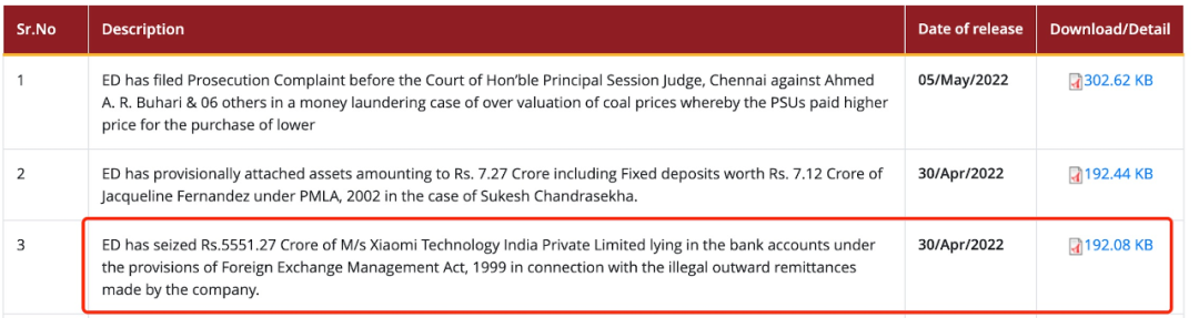 印度财政部下属执法局发布的扣押小米相关资产公告,图源印度财政部下属执法局