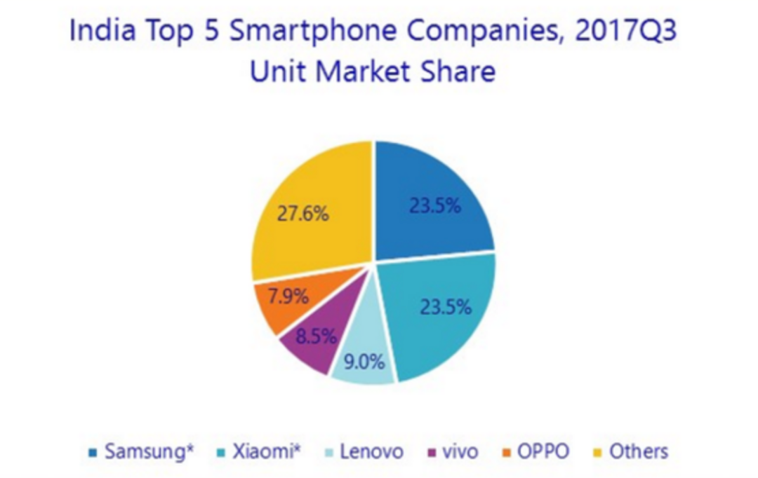 2017年第三季度印度智能手机的市场份额,图源IDC