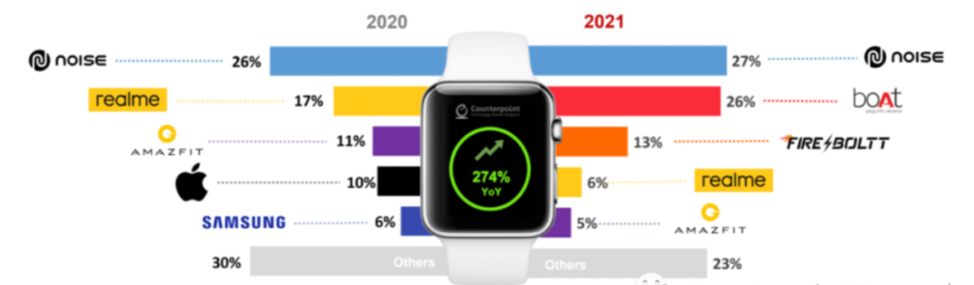 据Counterpoint的IoT Service最新研究显示,2021年印度智能手表市场出货量同比增长超过274%,创历史新高。印度本土品牌Noise以27%的份额在2021年领先着整个市场,印度国产品牌占据了市场总出货量的75%。