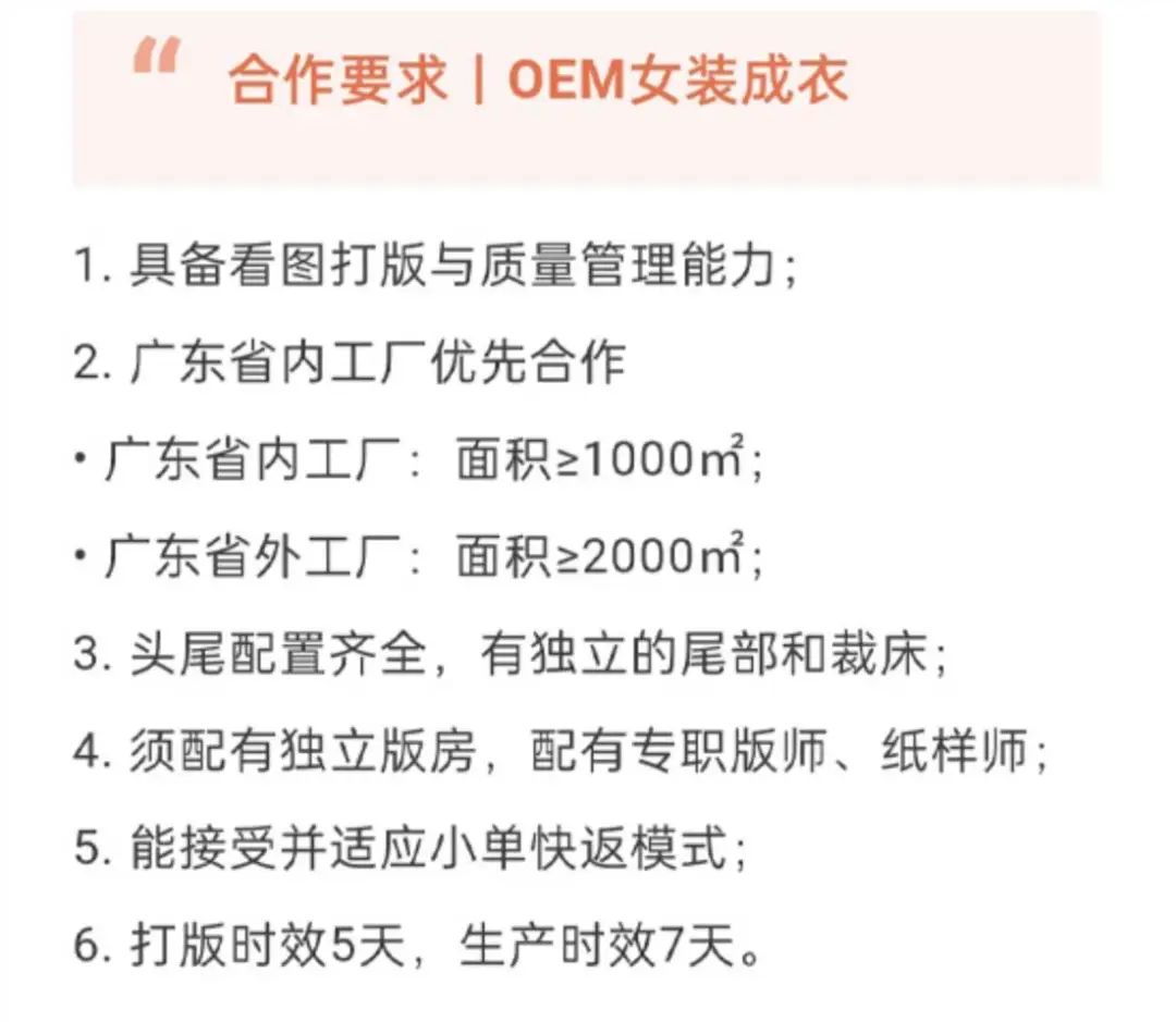 OEM模式要求打版时效5天、生产时效7天 来源 / SHEIN招商官网