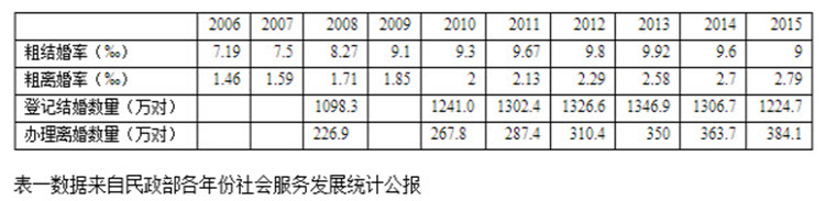 中国社会离婚率再创新高。据民政部7月11日发布的《2015年社会服务发展统计公报》显示,2015年,中国依法办理离婚手续的共有384.1万对,比上年增长5.6%,粗离婚率为2.79‰,比上年增加0.1个千分点。
