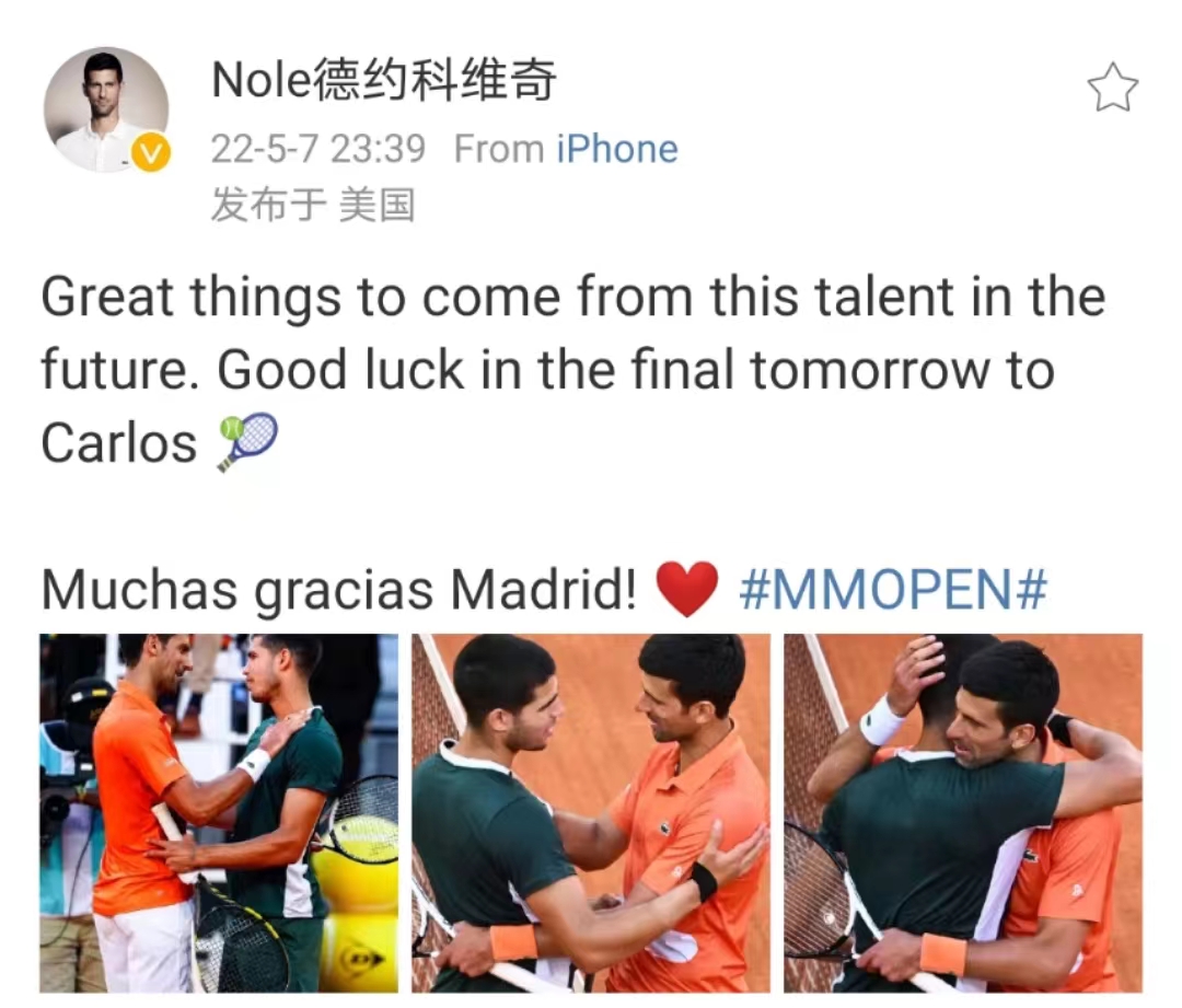 半决赛结束后,德约科维奇在社交媒体上写道:“这个天才未来一定会大有作为。祝卡洛斯在决赛中好运。”