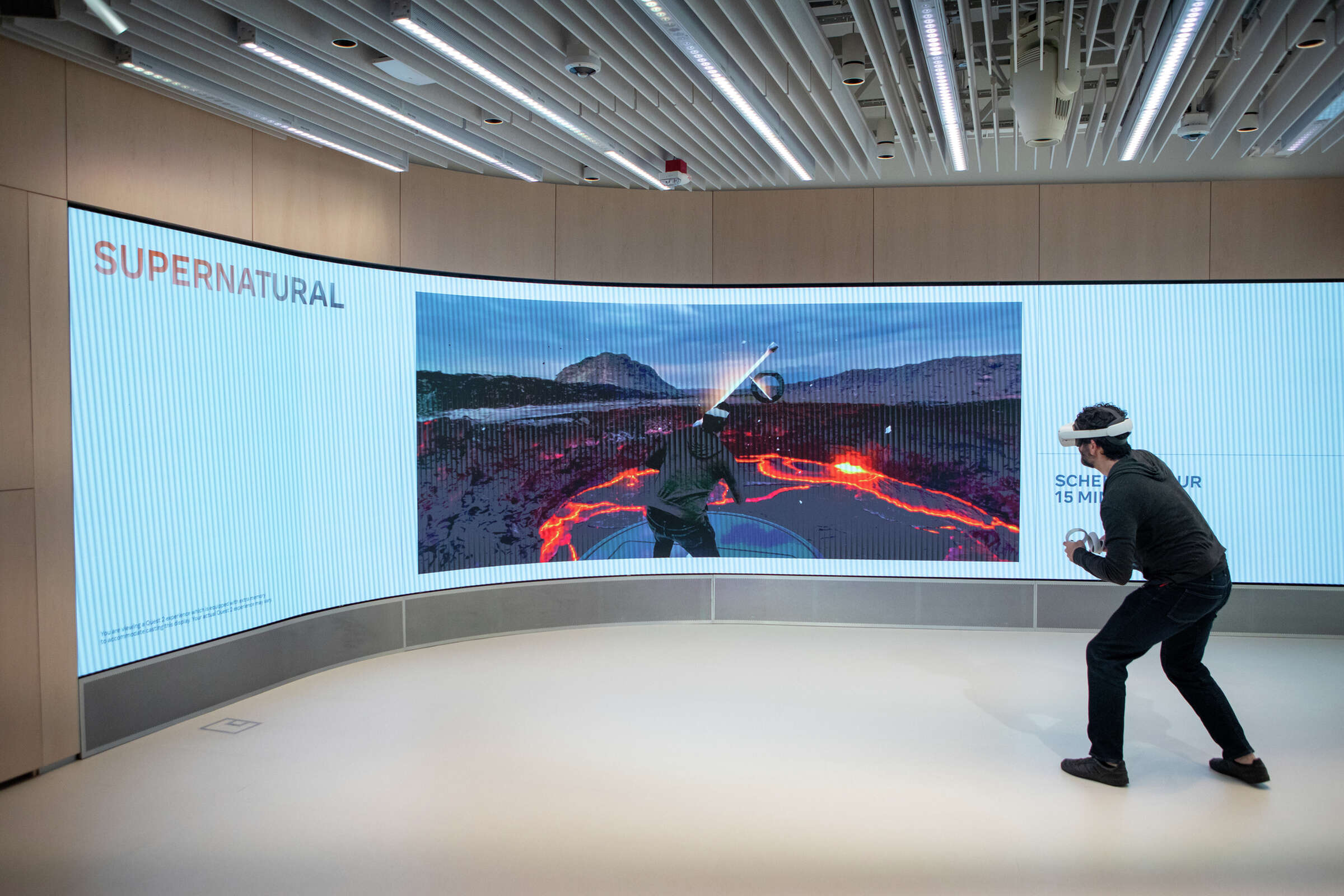 VR眼镜Quest Go显然是店里的明星产品,店内搭建了一个VR专属体验空间,就像几年前购物商场流行的VR体验区。足够的空间有助于体验者移动和挥舞手臂,而周边墙上配置的大型曲面LED显示屏幕会实时显示着体验者看到的虚拟画面,有助于周边群众围观。