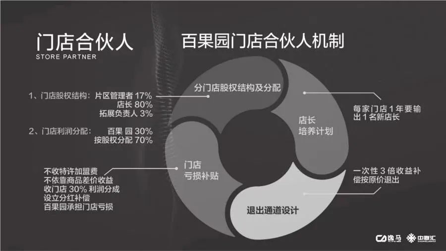 在门店合伙人制度上,百果园曾一直被认为通过利益设计很好地回避了加盟连锁中的许多问题,成为了百果园规模扩张中的品质稳定器,作为百果园的外部大脑,逸马集团一度将其作为标杆来包装。据悉,百果园的合伙制度涵盖股权分配、人才培养、亏损补贴、退出通道等四个方面。