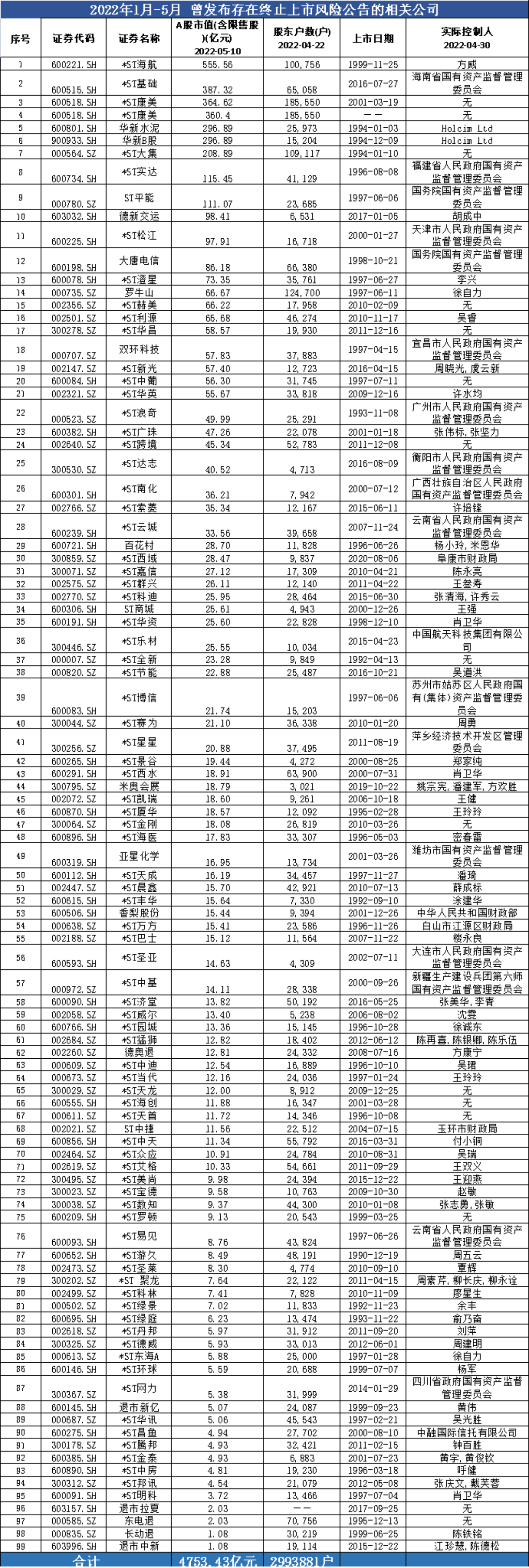 根据界面新闻统计,退市新规显威之下,自2022年1月至今,已有99家上市公司自2022年1月至5月,发布‘股票可能被终止上市的风险提示公告’,涉及总市值4753亿元,涉及股东户数接近300万户。在这其中也有诸多公司铆足了劲得以申请撤销退市风险。