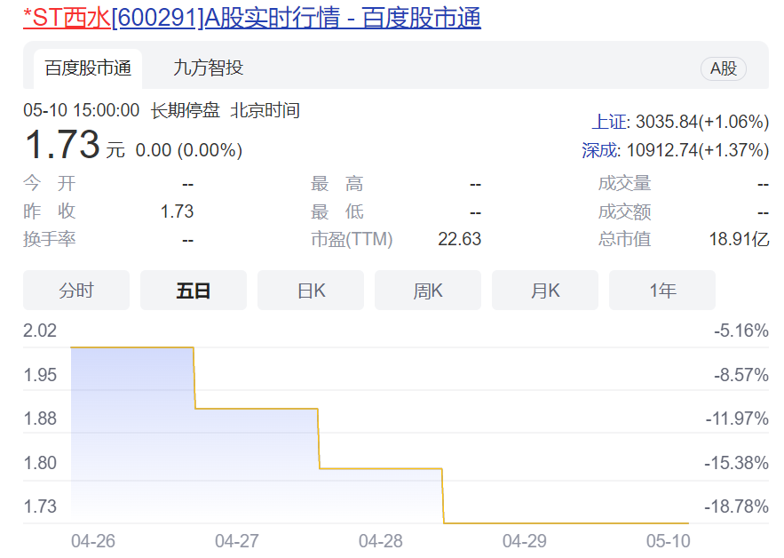 *ST西水股价从年初6.15元跌至停牌前的1.73元/股,总市值达18.91亿。