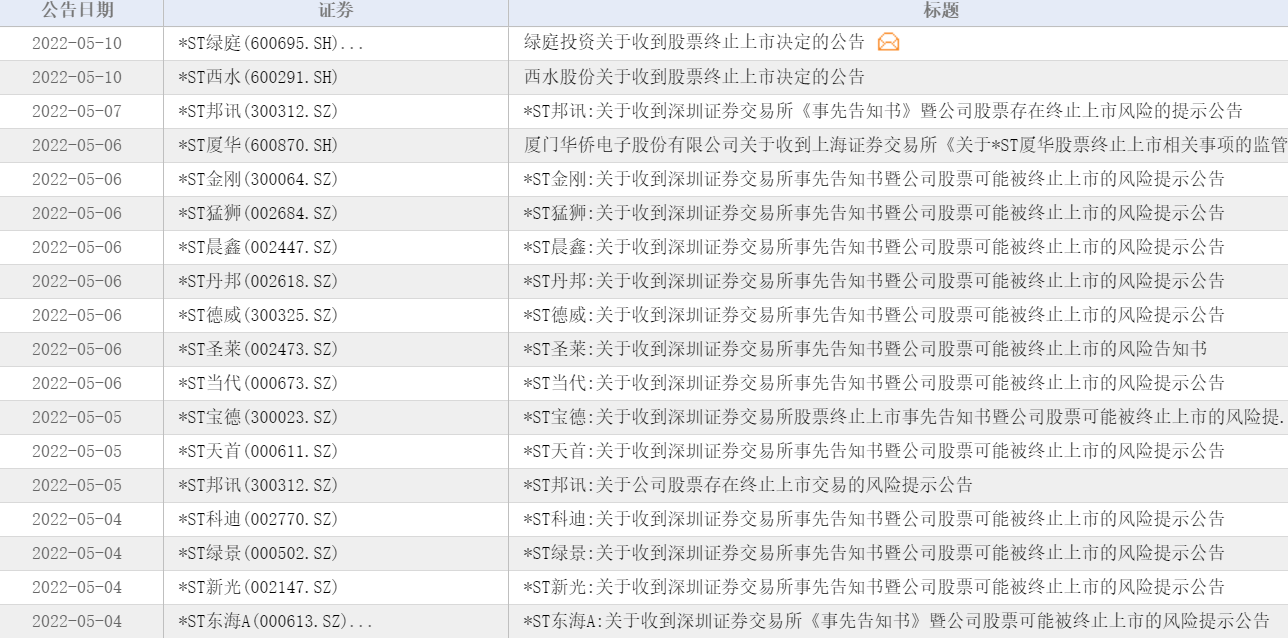 *ST德威、*ST绿庭(600695.SH)和*ST西水(600291.SH)不是个例,也不是首例。5月4日至今,已有*ST邦讯(300312.SZ)、*ST厦华(600870.SH)、*ST金刚(300064.SZ)、*ST猛狮(002684.SZ)、*ST丹邦(002618.SZ)、*ST晨鑫(002447.SZ)等14家公司收到深交所拟终止其上市的事先告知书。