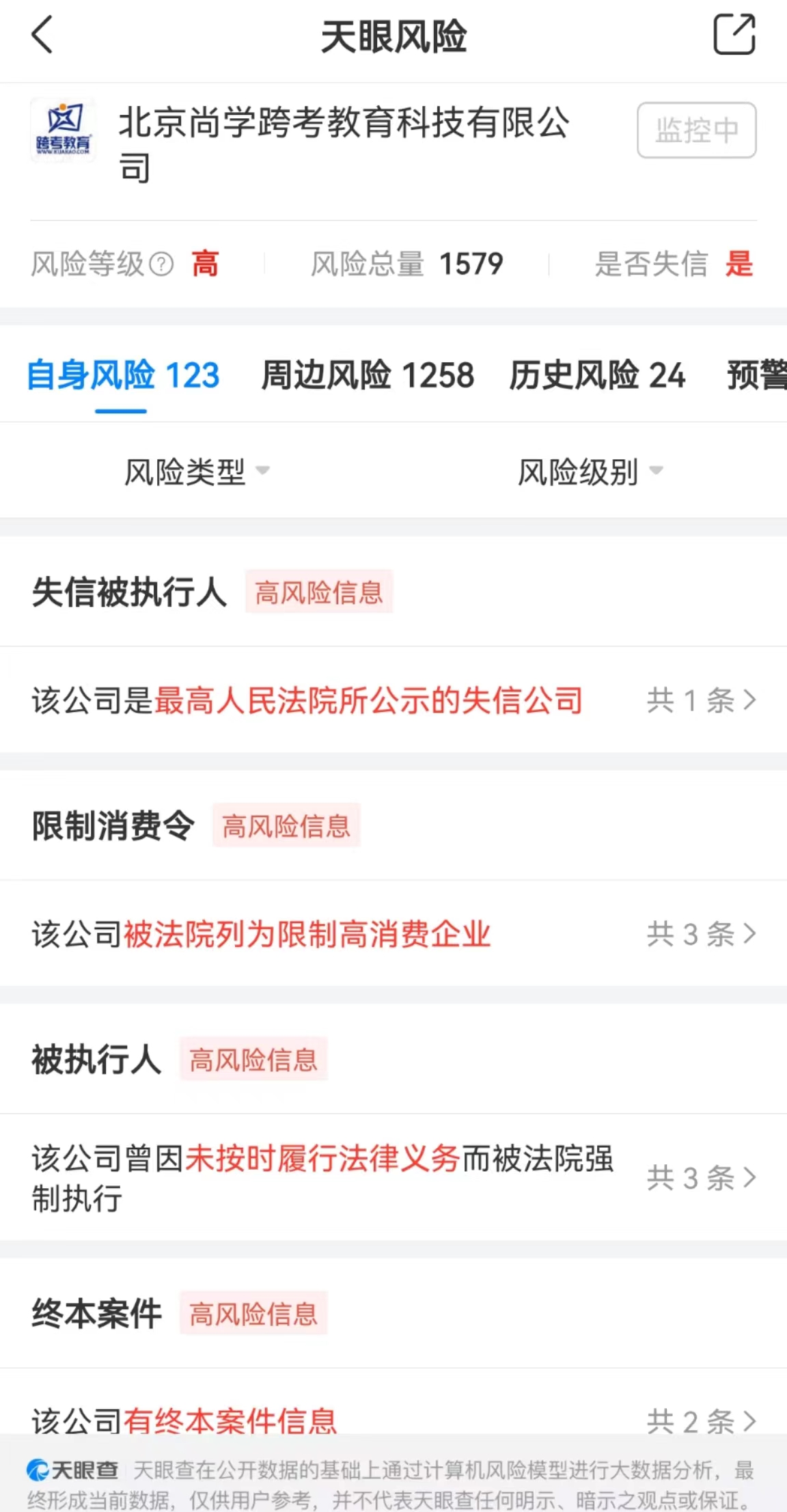 天眼查APP显示,尚学跨考今年新增多项高风险信息。今年3月,尚学跨考被北京市海淀区人民法院认定为失信被执行人;今年以来,尚学跨考先后3次被法院强制执行,执行总金额21.80万元;公司还存在多个终本案件信息、限制消费令,未履行金额共15万余元。