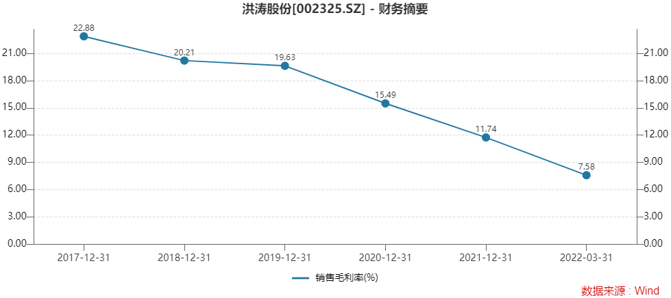毛利率方面,洪涛股份已出现连续五年下滑,由2017年的22.88%降至2021年的11.74%,2022年进一步跌破两位数大关,销售毛利率仅有7.58%。深交所要求其说明毛利率持续下降的原因及合理性,该趋势是否具有持续性。