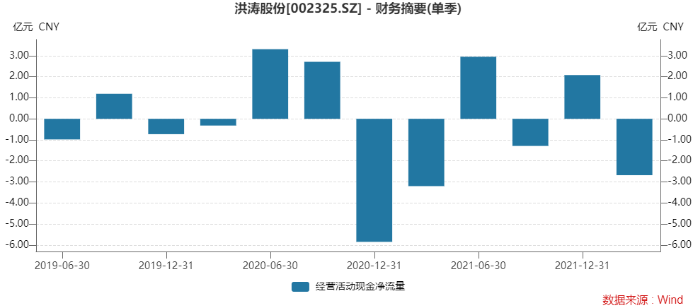 此外,洪涛股份季度现金流量净额大幅波动,时正时负。去年第一季度至第四季度经营活动产生的现金流量净额分别为-3.20亿元、2.95亿元、-1.29亿元、2.08亿元。但从近几年数据来看,并无明显的季度规律,每个季度均有亏有盈。如此波动的原因未明。