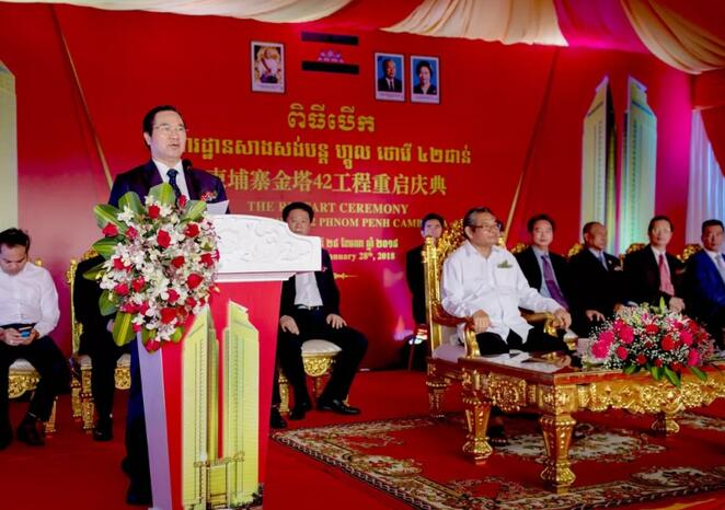 开工之日,柬埔寨时任多位官员到场。洪涛股份董事长刘年新踌躇满志,称有能力、有信心,让金塔42项目在2019年底披上金碧辉煌的新装。