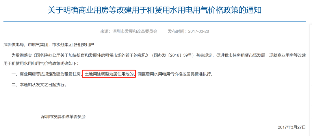 值得注意的是,深圳市发改委此前就曾经发布过《关于明确商业用房等改建用于租赁用水用电用气价格政策的通知》。但那份在2017年发布的文件,更多的是面向开发商,要求按规定改建为租赁住房,并且土地用途也要调整为居住用地。要实现这两个条件,并不容易。