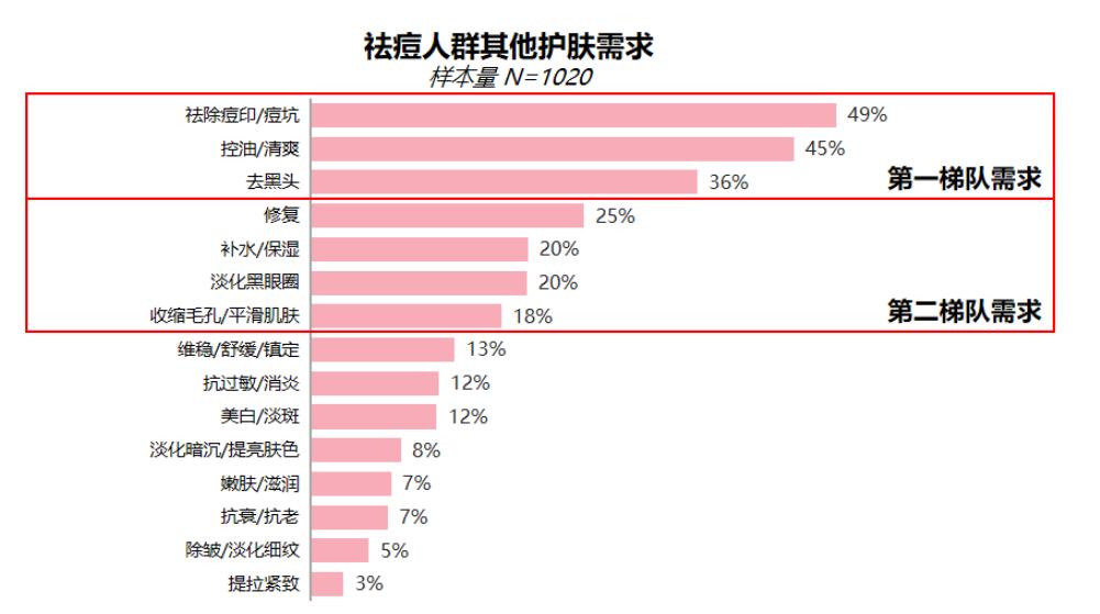 此外,痘肌问题衍生的抗炎修复、清洁控油、毛孔治理、美白淡化痘印、抗衰等一系列问题,都是一个个极具增长空间的细分市场。尤其是痘坑痘印问题,是祛痘后细分市场的第一大需求。