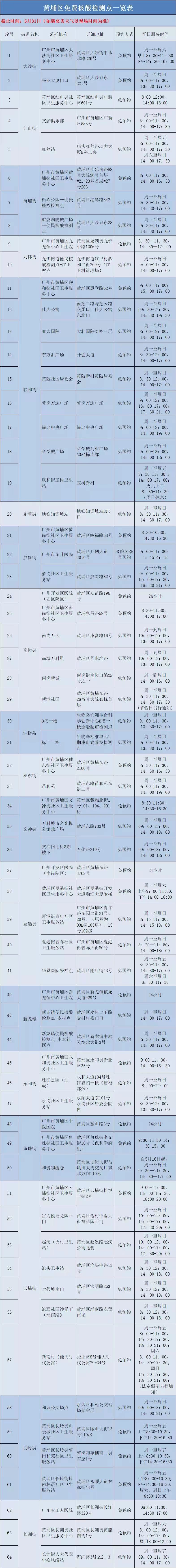 “广州黄埔发布”微信公众号15日消息,截至5月31日,黄埔区开展常态化核酸检测,共64个核酸采样点,为市民提供免费核酸检测服务,建议市民每5天检测一次核酸。