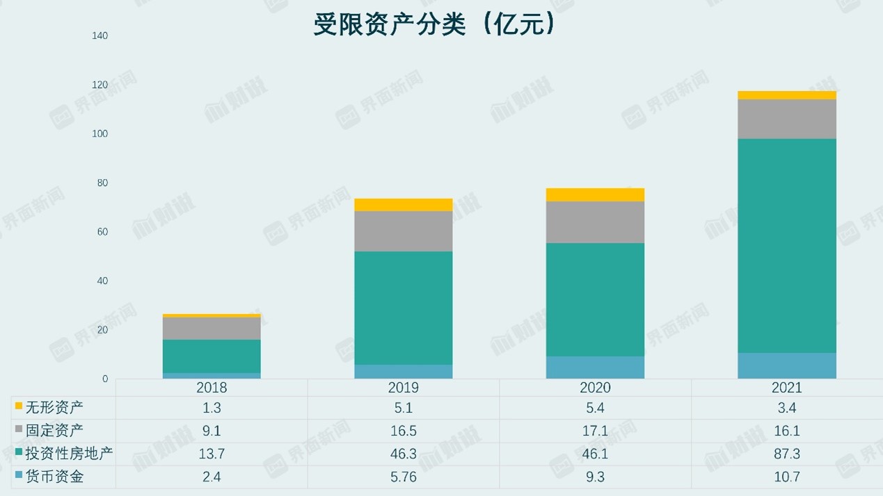 2018年,步步高受限资产为26.5亿元,其中用投资性房地产和固定资产抵押的达到22.8亿元。此后该数字迅速增加,到了2021年已经达到117.5亿元,其中投资性房地产达到87.3亿元。这样一番操作之后,步步高顺利获得了超过百亿的银行贷款。