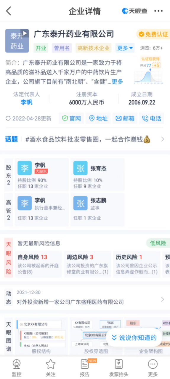 企业公开信息显示,广东泰升药业有限公司注册成立于2006年,注册资本6000万人民币,公司实控人为李帆。而该公司官网显示,广东泰升药业有限公司是一家集种植、研发、生产与销售于一体的全产业链集团化运营企业,建筑面积达30000平方米,拥有300多名员工,年产值达5亿元以上。主营业务包括西洋参、干燕窝、红参、鹿茸、石斛等各类贵细药材以及即食燕窝、即食花胶等即食滋补品的OEM贴牌代工服务。