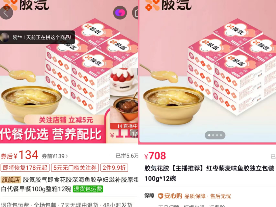 驰记、陈氏滋补堂等品牌则属于低端线,驰记在天猫店售价每碗近27元、抖音平台在抖音品牌店售价则每碗不足20元,陈氏滋补堂在天猫售价每碗22元,客服均表示,花胶采用是国内人工养殖的花胶。而胶气则是“谜一般”线,一款即食花胶产品在抖音售价超过每碗60元,相同产品在拼多多官方店售价却仅为每碗11元左右,客服均表示采用的是进口白玉胶,但当向其索要报关单等溯源材料时,对方却迟迟不提供。