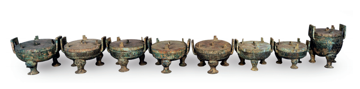 国家一级文物,共计8件。列鼎七件,尺寸依次递增,形制、纹饰相同,附耳直立,马蹄形足,有盖,平顶,盖顶四周有三个长方形钮,中间一半环形钮。陪鼎一件,子母口,深腹微鼓,圜底,蹄足。盖顶、腹、耳内侧均饰蟠螭纹,耳外侧饰S纹,腹中间饰一道凸弦纹。