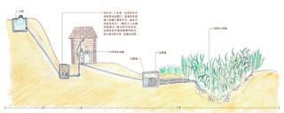 比起苦难的上水,下水倒是多出几分惬意。上山伊始,面对周围干旱的环境,我们很想在房前营造一片湿地,让园里的小气候更加湿润怡人,同时,也在这农地之间保留一片隐蔽之所,让本土的动植物在大太阳天儿里有个歇脚的阴凉,供它们繁衍生息。不过,想在旱地当中建绿岛,充足的供水是关键。既然水窖里的水舍不得用,为什么不用生活灰水(不含粪尿的生活废水)和自然雨水的组合供给这片小湿地呢?想到这里,我们一拍即合,说干就干,人工湿地建设就从这“下水”开始如火如荼地展开了。