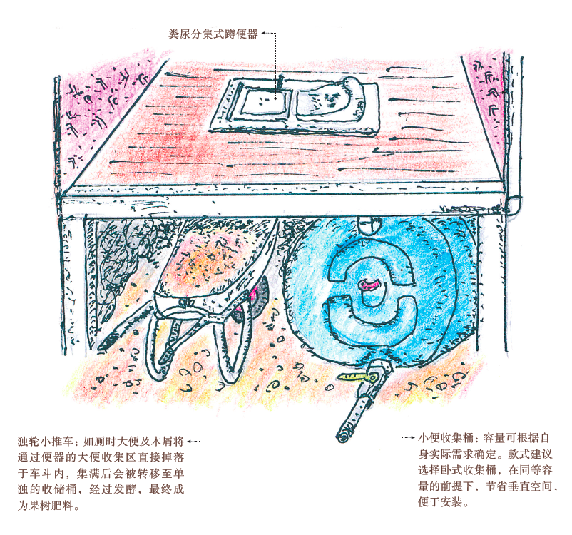 旱厕如此可怕,为何我们还要执意选择呢?难道为了省水,连如厕的基本感受都不考虑了吗?区别于传统旱厕,我们在山上使用的是:粪尿分集式生态旱厕。旱厕中选择的是一种特制蹲便器,由前后两部分组成,可以将大便和小便自然分开,即干湿分离,再进入各自的收储装置分别存放。其中的大便部分,每次如厕后需要使用木屑覆盖,离开前盖上盖子就算大功告成。看似操作简单,带来的变化可不容小觑。首先,粪尿分离后,兵分两路导引至室外,小便产生的带有刺激性的氨气随之导出;其次,大便不再与小便液混合,加上有干燥木屑覆盖和良好的通风,臭臭的味道也消失无踪。就连苍蝇们看到这样的“干便便”也会直翻白眼,这种栖息环境的改变,让它们不得不考虑换个地方生儿育女。这样一来,伙伴们在如厕时,眼前除了点木屑外再无其他,心情似乎也跟着清爽起来。不仅如此,盛夏时节里,覆盖着大便的木屑中间还长出过大大的蘑菇,让当时的我俩围着便器兴奋观察了好半天,这种物质循环的感觉真是棒极了!