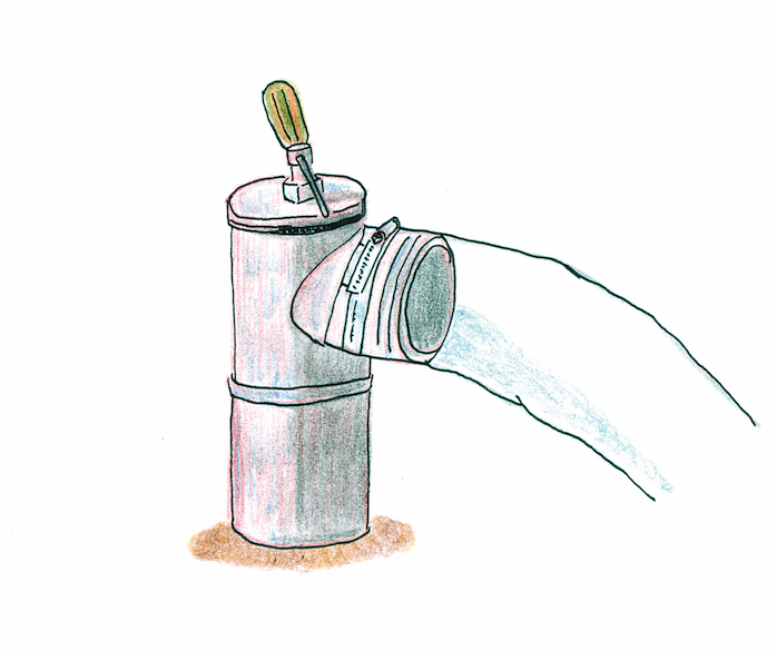 先说“上水”,供给稳定、质量可靠的水源,是生活的基本保障。由于我们住在干旱少雨的浅山地带,周边既无河流也无山泉,唯一的地表水就是低洼地面在雨后形成的大小水坑,充其量供鸟儿们嬉戏玩耍。在山上生活,真正的上水其实来自百米深地下。这些深层的水源通过机井房的水泵被抽到地表,再经由4 寸(内径约100 毫米)的地下水管输送到我们家,这个过程为“叫水”。紧接着问题来了,毕竟是用于灌溉的水管,这么粗的管径,这么大的水压,根本无法与自家水池中小小的4 分(内径约15 毫米)龙头直接接驳。再说,叫水是按照小时计费,水泵更是邻里之间轮流使用的公共设施,也不能一直为咱家开着呀!