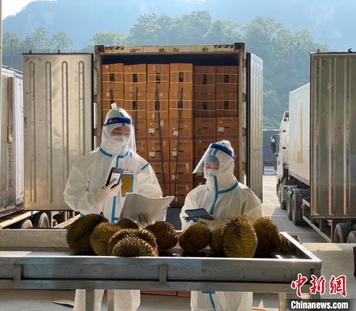 疫情下,友谊关海关关员正在对进口榴莲进行查验。 邓光平 摄