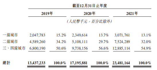近三年来,万达广场在一线城市的收入占比也不断下滑,从2019年的15.2%跌落至2021年的13.1%,二线城市也从34.2%下滑至32.0%。唯有三、四线城市的收入占比在上升。由于一、二线城市的商业广场已呈现饱和状态,万达难以找到更多增长点,只能向下沉市场寻找更多可能性。但这与其院线布局又存在矛盾,因为一、二线城市往往是国内最大票仓。
