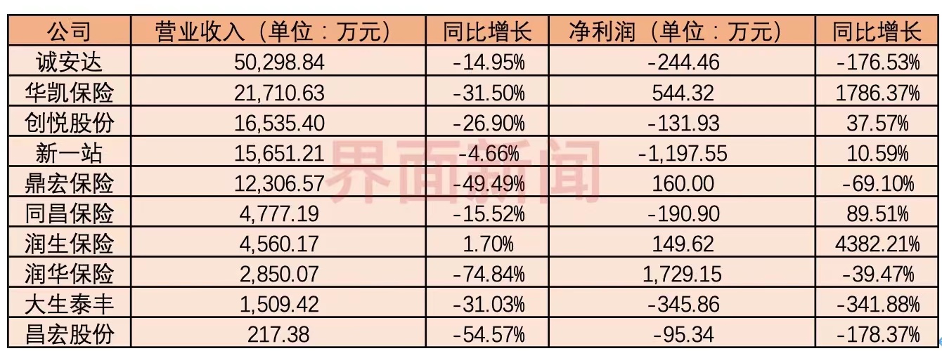 界面新闻记者梳理发现,受车险综改、疫情等因素影响,9家公司营业收入下滑,归属于挂牌公司股东的净利润(以下简称“净利润”)普遍承压,仅4家公司实现盈利。