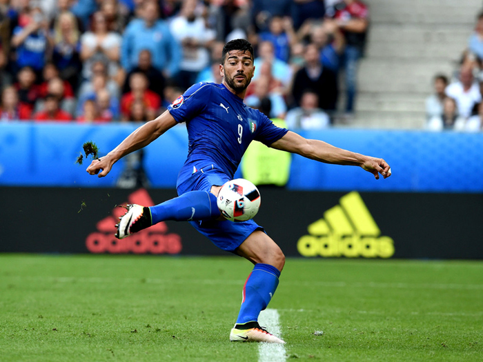 16. 佩莱(意大利,山东鲁能) 对于落魄贵族意大利来说,佩莱与埃德尔的锋线组合并不出名,然而前者已经用自己的表现在欧洲杯上大放异彩。首战小组最强对手比利时,他先是用一个凌空扫射为球队锁定胜局;1/8决赛面对西班牙,佩莱几乎用相同的方式将卫冕冠军送回了家。