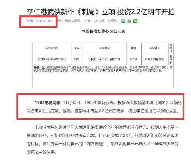 该项目早在2016年就已经被提上日程。当年还如日中天的乐视影业宣布将采用影剧联动的方式拍摄圆太极畅销小说《刺局》同名作品。据传言这部由李仁港执导的影版投资多达2.2亿元,而另一部至今还未浮出水面的剧版预算也达到亿级。