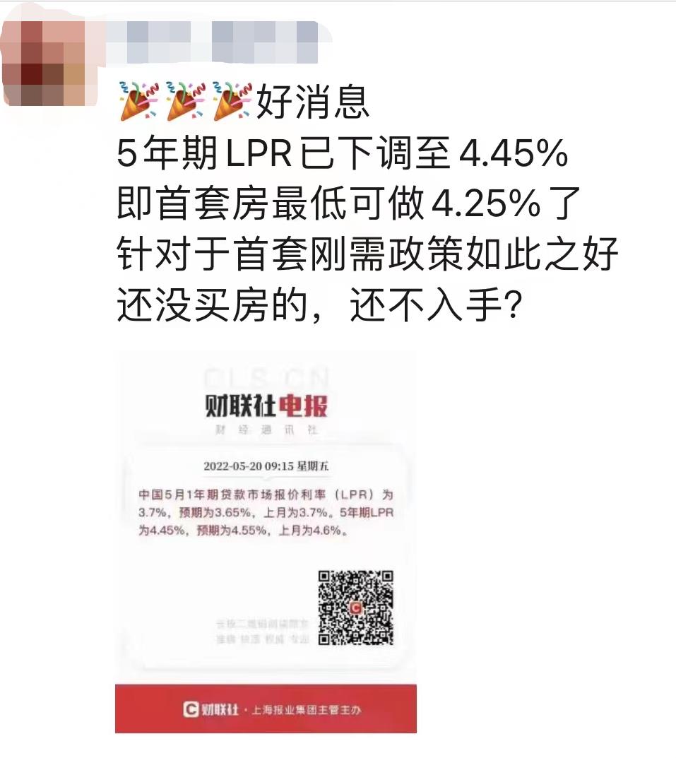 今日央行公布5月五年期LPR从4.60%下调至4.45%。据某房地产经纪人表示,目前重庆部分银行已开始执行最新贷款标准:首套房利率执行4.25%,二套房利率执行5.25%。